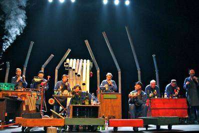 Zic Zazou, c’est neuf musiciens-comédiens-chanteurs qui jouent de multiples instruments parfois incongrus. De la fanfare recyclée punk au rock mâtiné de musette et de funk, ils mélangent tout, en gardant la substantifique vitalité. Ils sont aussi à l’aise à la guitare électrique, au piano, au trombone qu’aux pieds de chaise, aux marteaux ou aux bouteilles. Ils composent leur musique, la jouent et explorent les mille et une possibilités mélodiques et rythmiques des objets qu’ils fabriquent, recyclent ou détournent pour nous offrir un gigantesque poème musical. C’est ingénieux, ludique, poétique, les initiés apprécieront la performance et les autres se laisseront porter par la magie de la représentation.